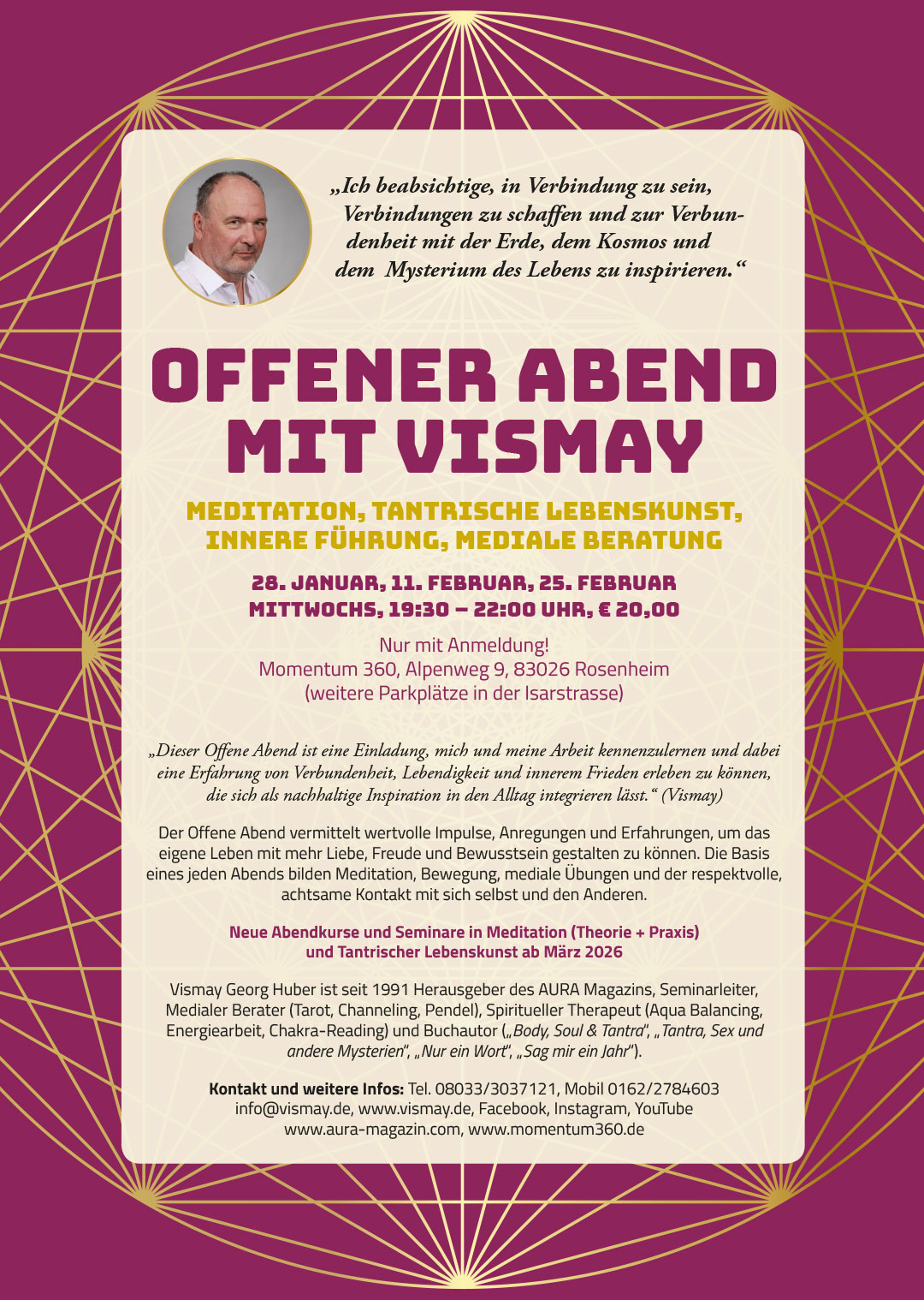 „Dieser Offene Abend ist eine Einladung, mich und meine Arbeit kennenzulernen und dabei eine Erfahrung von Verbundenheit, Lebendigkeit und inneren Frieden erleben zu können, die sich als nachhaltige Inspiration in den Alltag integrieren lässt.“ (Vismay)